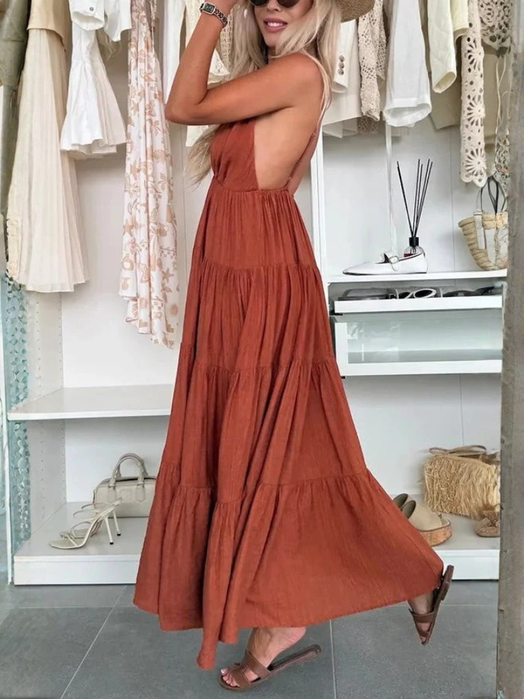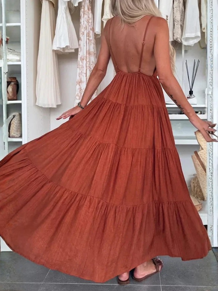 Grâce à son dos nu et à ses étages plissés, cette robe crée un mouvement naturel et une silhouette aérienne. Sa coupe longue et fluide est idéale pour les journées ensoleillées, les vacances ou les sorties estivales.