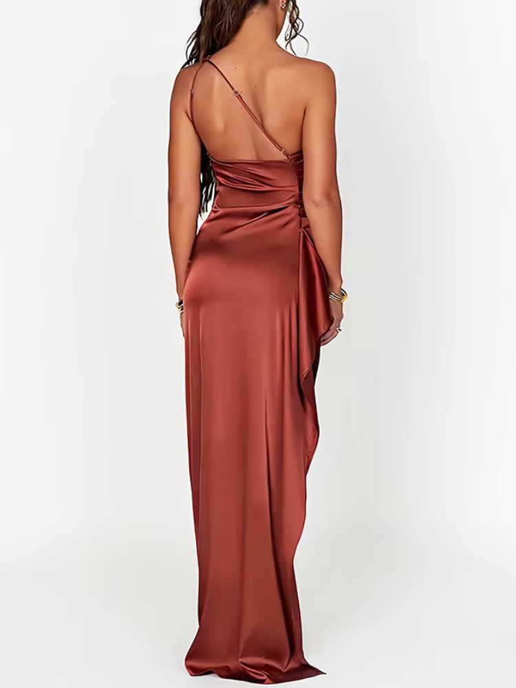 Conçue pour sublimer la silhouette, cette robe longue fendue en tissu satiné offre un look raffiné et moderne. Sa coupe asymétrique et son effet drapé mettent en valeur les formes tout en apportant une touche glamour.