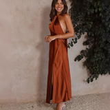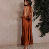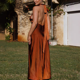Robe longue terracotta satinée dos nu à nouer élégance et sensualité réunies
